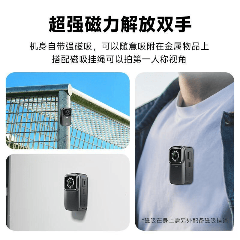 独特的磁性设计让相机轻松固定在金属表面,再也不用为找不到合适支撑而烦恼。无论是滑雪、骑行,还是潜水拍摄,随时随地便于释放双手,捕捉精彩时刻。